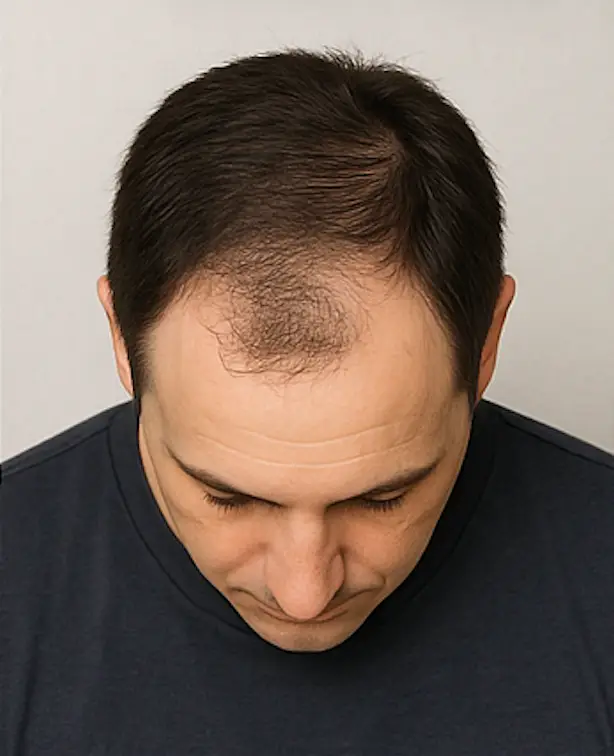 Le sommet du crâne est dégarnie, seule la couronne reste dense. Greffe importante (jusqu’à 5000 greffons) sur deux journées, associée à un traitement d’entretien.