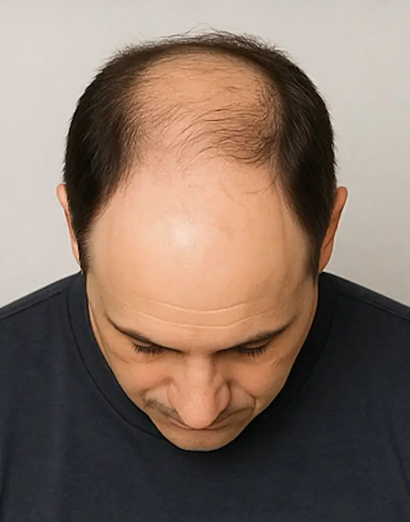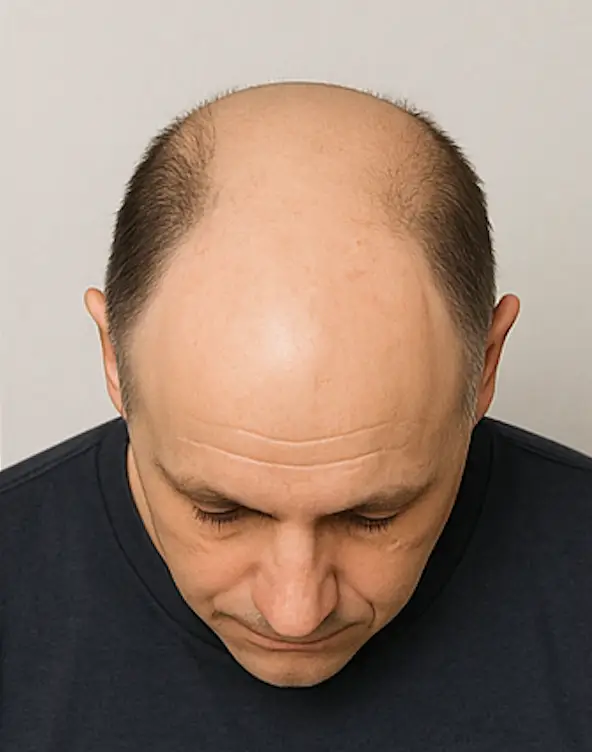 La calvitie est complète, ne laissant qu’une fine bande de cheveux à l’arrière. Une greffe partielle ou un complément capillaire peut être envisagé selon la qualité de la zone donneuse.